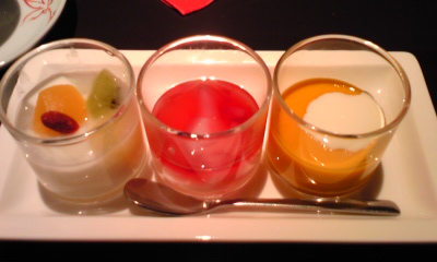 ・デザート3種(左から杏仁豆腐、ライチゼリー、マンゴープリン)