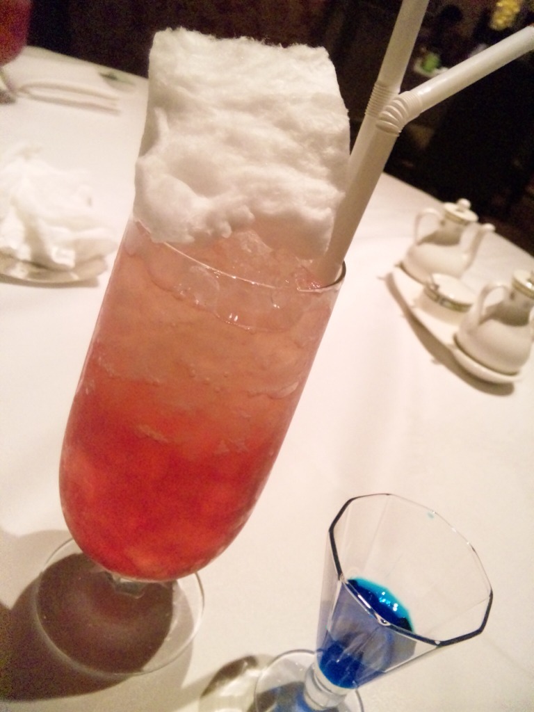 上に乗ってるモコモコは綿あめで、右の青いシロップをかけて溶かして飲むんですが、あまり入れすぎると甘いので注意!