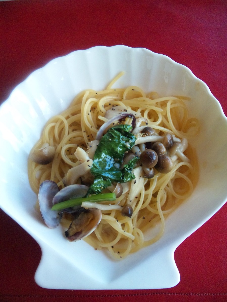 ホウレン草とシメジとアサリとベーコンが入ってるクリームパスタですvv