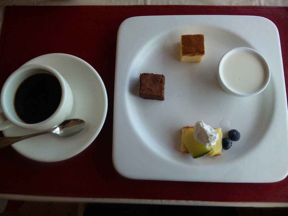 デザートはチーズケーキ、ガトーショコラ、スポンジケーキフルーツのせ、クレームブリュレの4種盛りvv